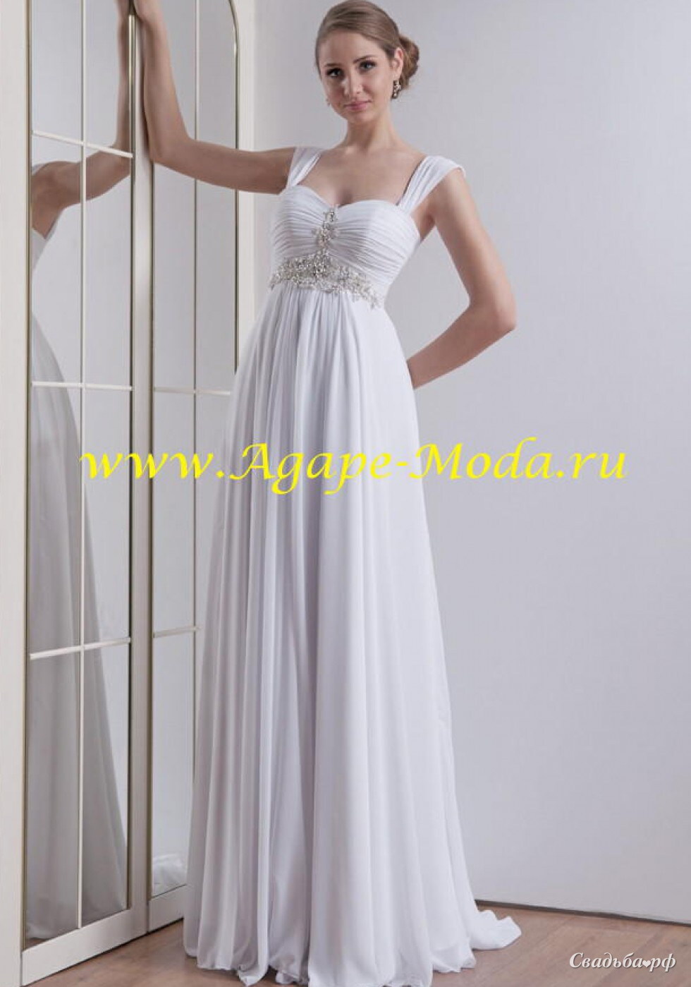 Струящийся свадебный наряд в греческом стиле выполнен из нежного шифона кремового оттенка. Широкие бретели-плечики обрамляют открытую зону декольте. Завышенная талия подчёркнута сверкающим пояском. Драпировка на груди зрительно увеличивает бюст. Длинная юбка свободного кроя доходит до самого пола. Стильно и восхитительно!
