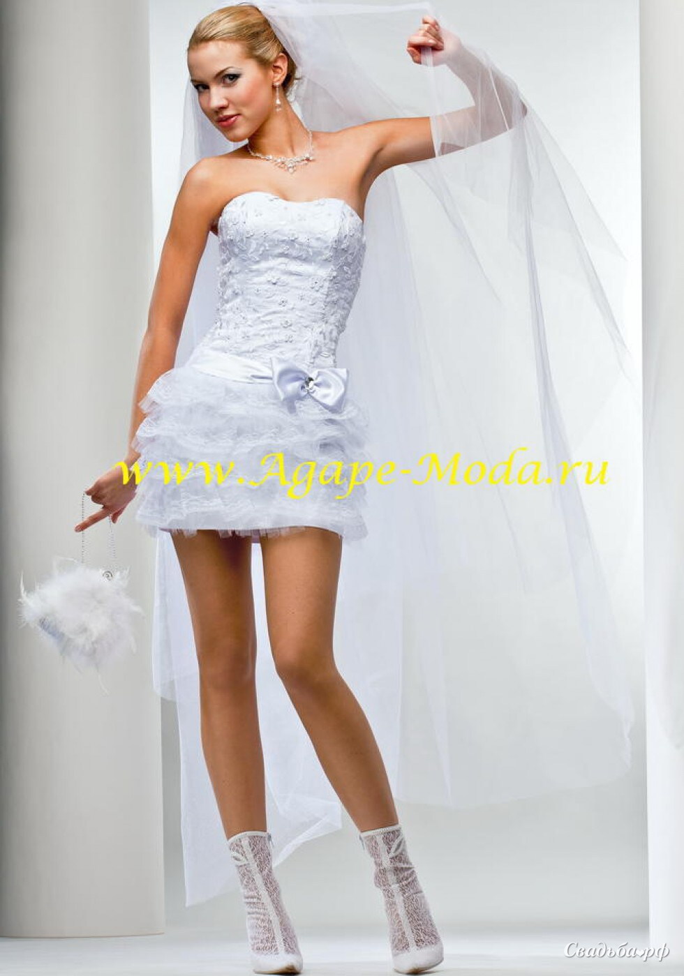 Кокетливый наряд из новейшей коллекции 2015 года понравится самым дерзким и стильным невестам. Чуть заниженный корсет с открытой зоной декольте украшен рельефной вышивкой. Граница между корсетом и юбкой дополнена широкой лентой с миниатюрным бантиком. Короткая юбочка с полупрозрачными ярусами едва доходит до середины бедра.