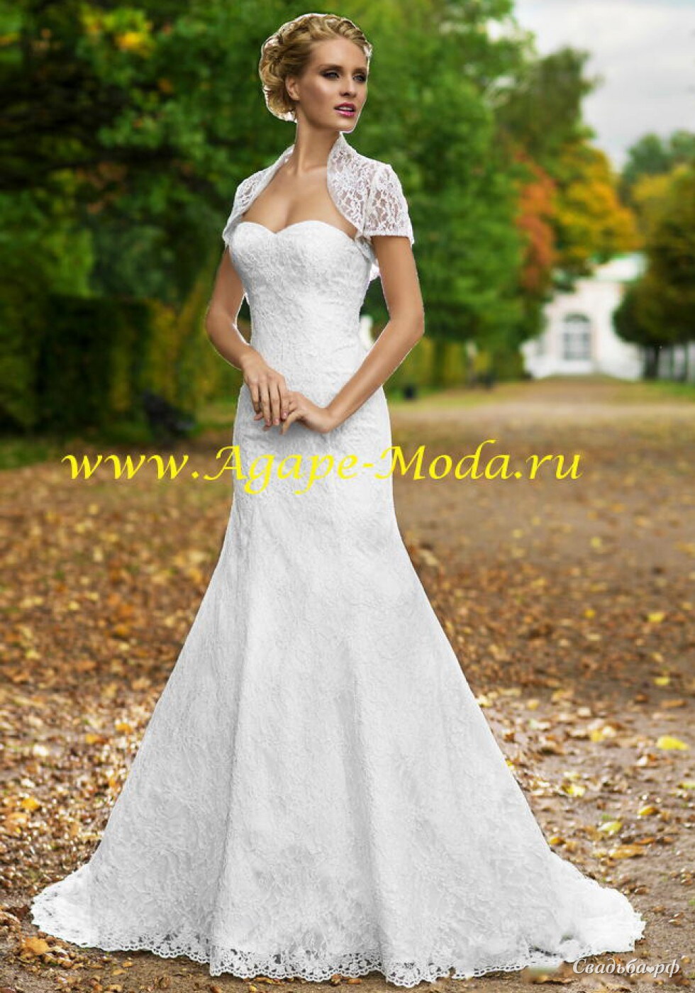 Изысканное свадебное платье с соблазнительной зоной декольте дополнено очаровательной накидкой-болеро. Наряд силуэта Русалочка представлен в новой коллекции 2015 года. Ажурное платье облегает фигуру и выгодно подчёркивает женственные изгибы. От середины бедра юбка начинает расширяться и постепенно переходит в игривый шлейф.