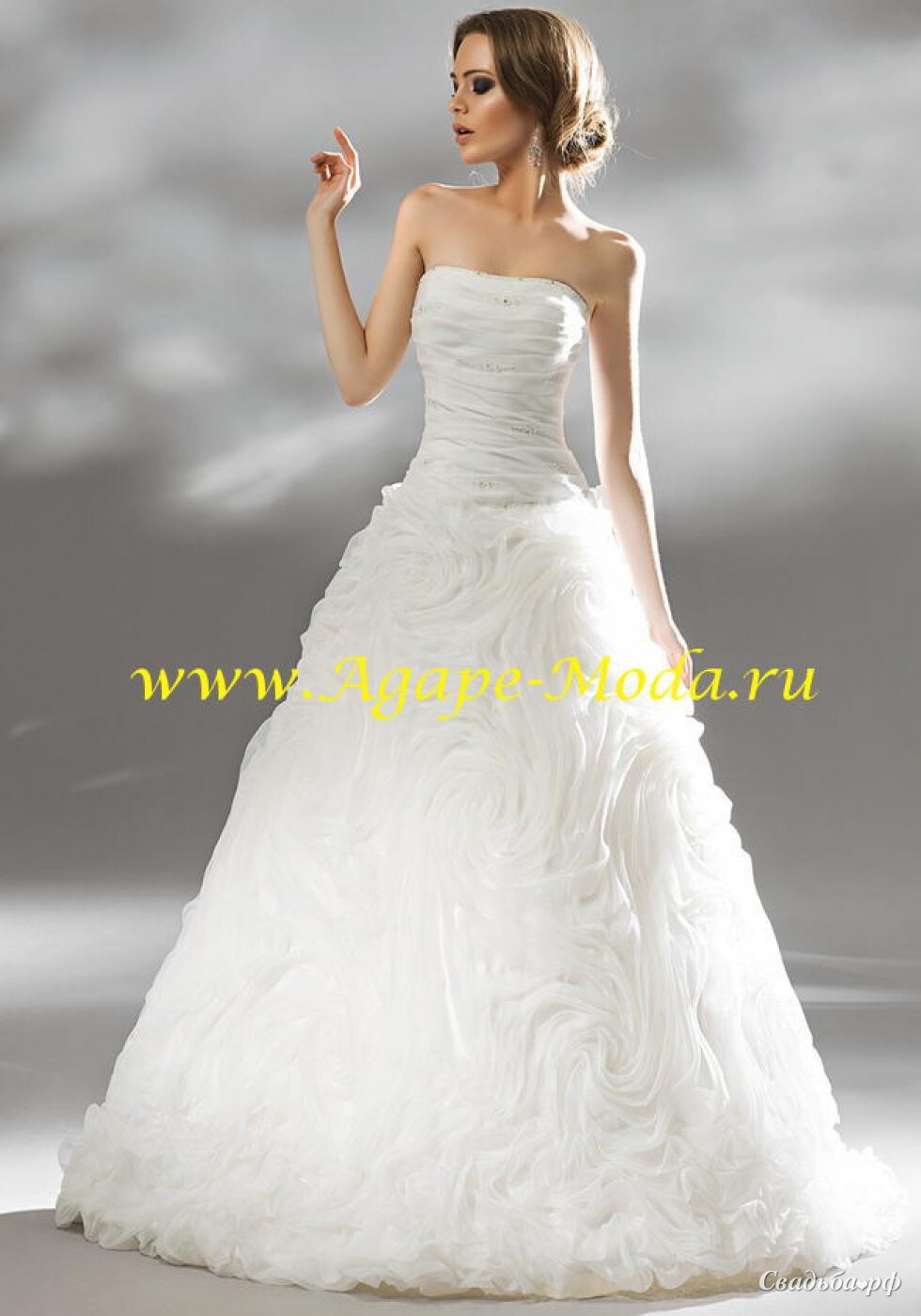 Нежный свадебный наряд из новой коллекции 2015 года станет изюминкой Вашего образа. Драпированный корсет с открытой зоной декольте идеально садится по фигуре. Платье не перегружено декором, благодаря чему смотрится изысканно и лаконично. Длинная юбка может похвастаться необычной фактурой: складки драпировки образуют бутоны роз.