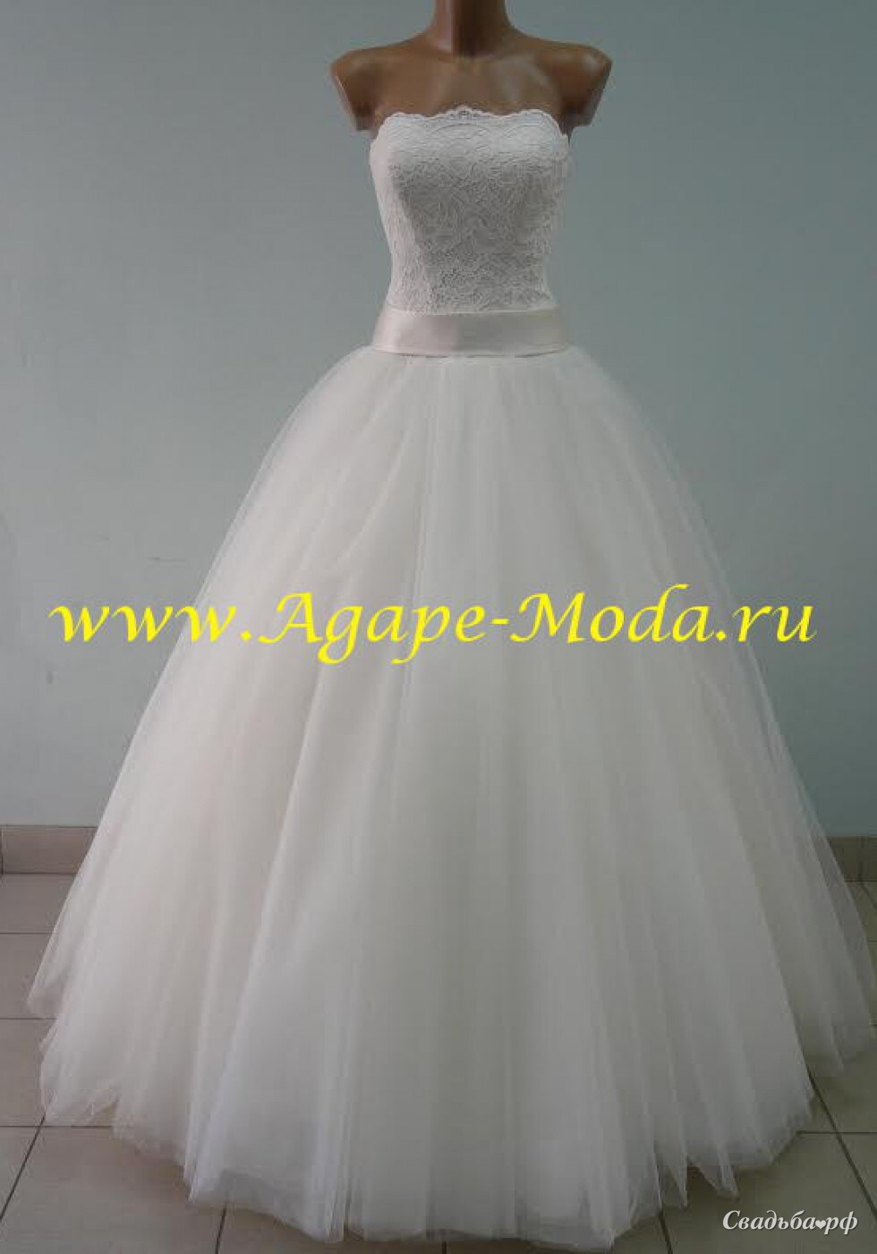 Лаконичное свадебное платье из свежей коллекции 2015 года понравится истинной леди. Ажурный корсет с открытой зоной декольте и широким поясом идеально садится по фигуре и выгодно подчёркивает женственные изгибы. Пышная юбка из невесомой ткани придаёт образу неземную лёгкость. Наряд отличается лаконичным дизайном и безупречными формами.