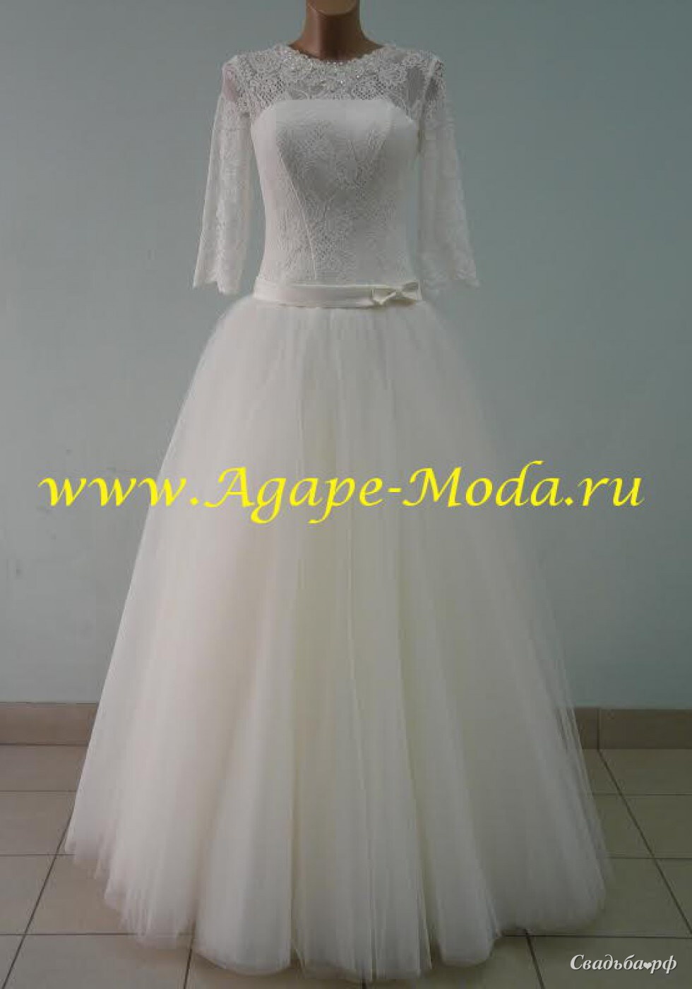 Романтичный свадебный наряд с ажурной вставкой на груди и ажурными рукавами 3/4 отвечает основным модным тенденциям 2015 года. Талия подчёркнута атласной лентой с миниатюрным бантиком. Пышная юбка отличается неземной лёгкостью и воздушностью. Наряд идеально садится по фигуре и подчёркивает её достоинства. Отличный вариант для нежной натуры.