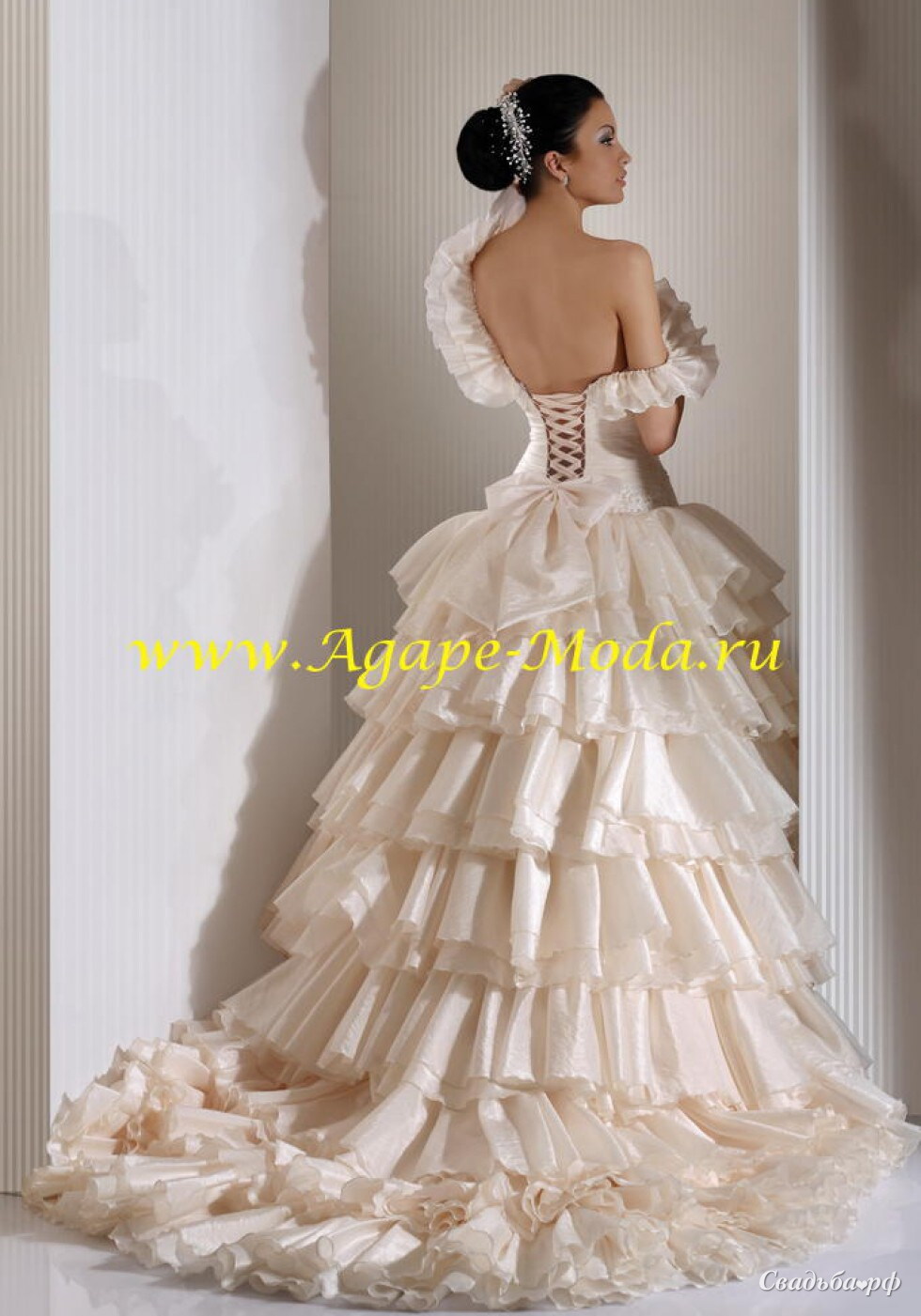 Эффектное свадебное платье в духе Кармен представлено в свежей коллекции 2015 года. Оголённая спинка обрамлена пышными бретелями. Корсет дополнен удобной шнуровкой на спинке и кокетливым бантом на пояснице. Многоярусная юбка с объёмными воланами переходит в такой же шлейф. Романтичное свадебное платье кремового цвета.