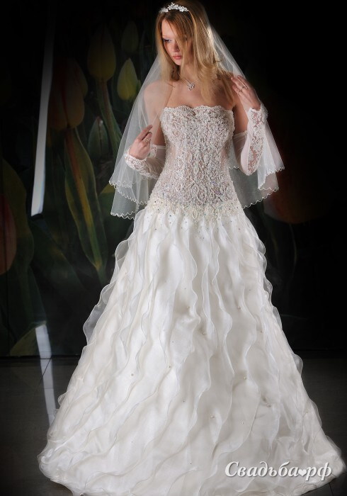 Романтичный свадебный наряд с открытой зоной декольте и полупрозрачным корсетом создан для роковых красавиц, не боящихся экспериментов. Корсет украшен тончайшей вышивкой ручной работы. Длинная юбка с оригинальными вертикальными воланами расширяется к полу. Этот свадебный наряд представлен в широком размерном ряду: от 38 до 50.