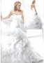 Потрясающее свадебное платье с открытой зоной декольте и удобной шнуровкой на спинке. Лаконичный наряд украшен двумя сверкающими вставками: на верхнем крае корсета и на бедре. Драпированный корсаж занижен, благодаря чему подчёркивает все женственные формы тела. Пышная юбка со множеством воланов и шлейфом начинается от середины бедра.