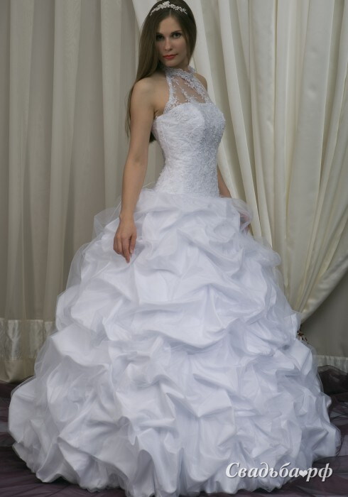 Расшитый вручную корсет с кружевной вставкой на груди идеально садится по фигуре. Пышная юбка с многоярусными объёмными сборками придаёт образу неземную лёгкость и торжественность. Платье доступно в разнообразных цветах. Наряд представлен в широком размерном ряду: от 38 до 56.