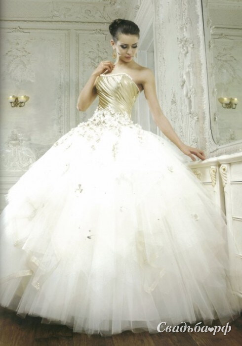 Роскошный свадебный наряд А-силуэта поможет создать образ настоящей императрицы. Драпированный корсет с открытой зоной декольте переливается в лучах света. Пышная юбка поражает своей воздушность. Граница между корсетом и юбочкой декорирована изящными цветами ручной работы. В таком потрясающем наряде Вас запомнят навсегда!