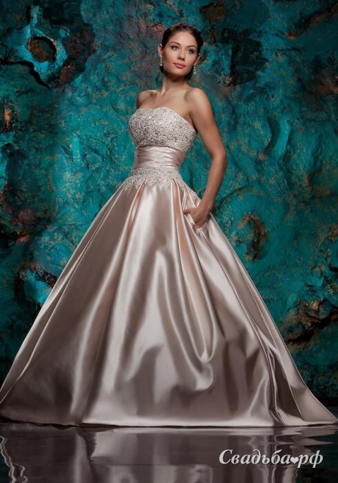 Атласное свадебное платье с кружевным корсетом и такой же баской идеально подчёркивает бюст и талию. Грудь расшита бисером и стразами. Широкий пояс придаёт образу особый шик. Пышная юбка переливается в лучах света. Эта модель доступна в нескольких цветах. Наряд представлен в широком размерном ряду: от 38 до 56.