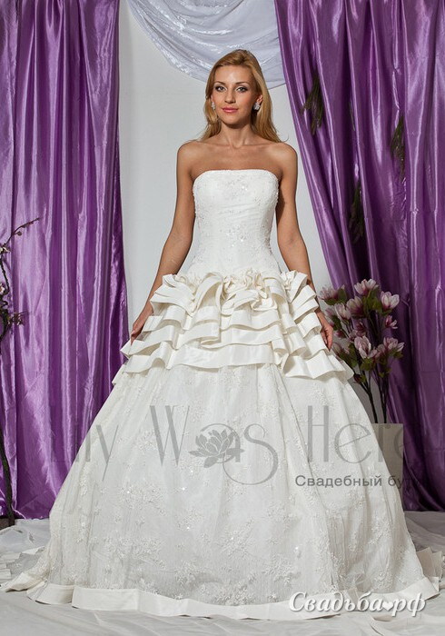 Все платье создано из полотна кружева, которое подчеркнуто игривой дополнительной юбочкой, меняющей свое настроение при движении! А отделка фаты, совпадающая с кантом юбки - приятное дополнение к образу!