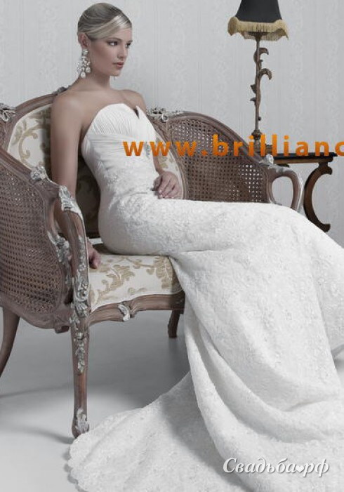 Эффектный свадебный наряд с открытой зоной декольте и изящно драпированным корсетом покоряет с первого взгляда. Лёгкая драпировка на груди помогает зрительно увеличить его. Длинная юбка расширяется к полу и переходит в поистине королевский шлейф. Наряд поражает необычной фактурой. В таком платье Вы будете казаться ещё выше и стройнее.