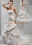 Роскошное свадебное платье поможет создать королевский образ. Заниженный корсет с пикантно оголённой зоной декольте украшен тонкой вышивкой контрастного цвета. Платье дополнено удобной шнуровкой на спинке. Пышная юбка с объёмными сборками и сверкающими вставками начинается от середины бедра и постепенно переходит в шлейф.