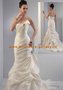 Свадебное платье с открытой зоной декольте поражает безупречностью форм. Изюминка наряда – сверкающие брошки на груди и на бедре. Драпированный корсет зрительно увеличивает бюст и выгодно подчёркивает женственность фигуры. Длинная юбка расширяется к полу и переходит в шлейф. Объёмные сборки в нижней части юбочки придают образу неповторимость.