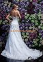 Кружевное свадебное платье безупречного белого цвета поможет создать девственный образ современной невесты. Заниженный корсет с открытой зоной декольте и оголённой спинкой дополнен широким поясом и крупным цветком ручной работы. Длинная юбка расширяется к полу и переходит в потрясающий шлейф. Романтичный наряд для стильной красавицы.