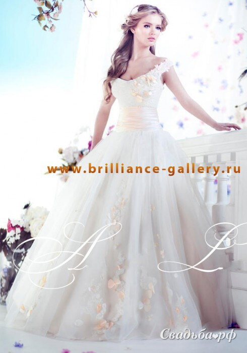 Восхитительный свадебный наряд А-силуэта декорирован нежными лепестками персикового цвета. Широкий пояс такого же оттенка эффектно подчёркивает осиную талию невесты. Округлый вырез на груди обрамлён приспущенными плечиками. Пышная юбка с полупрозрачным верхним слоем придаёт образу неземную лёгкость. Вы будете неотразимы!