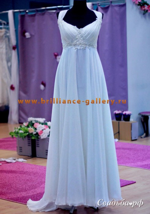 Лёгкий свадебный наряд выполнен в греческом стиле из нежнейшей ткани. Вырез на груди обрамлён широкими бретелями. Завышенная талия украшена ажурной аппликацией. Бюст эффектно подчёркнут сборками. Длинная юбка струится до самого пола и зрительно вытягивает силуэт: в таком наряде Вы будете ещё выше и стройнее. Почувствуйте себя богиней!