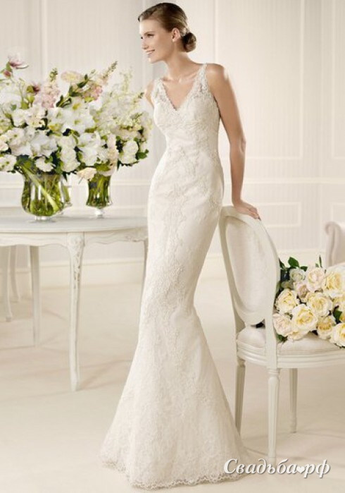Самым утончённым невестам понравится это свадебное платье от известного бренда La Sposa. Кружевной народ с кокетливым V-образным вырезом на груди и изящными бретелями отличается лаконичностью декора и безупречными формами. Модель идеально садится по фигуре и подчёркивает женственные изгибы. Длинная юбочка постепенно расширяется к полу.