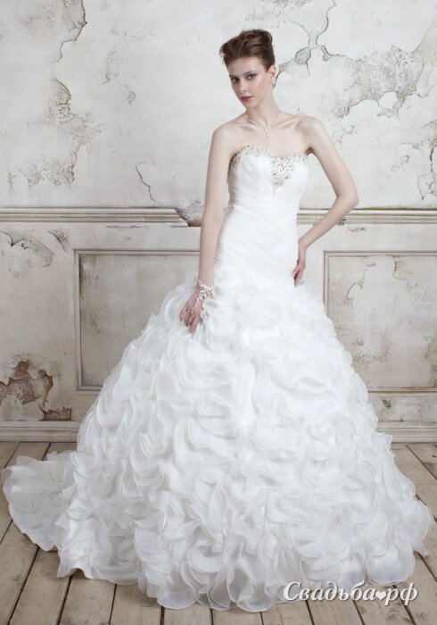 Потрясающее свадебное платье от именитого бренда Cristana Carrera создано для самых требовательных модниц. Заниженный корсет с открытой зоной декольте, тонкой драпировкой и сверкающей вышивкой идеально садится по фигуре. Пышная юбка с многоярусными воланами необычной формы переходит в кокетливый шлейф. Гармоничный и неповторимый образ.
