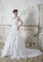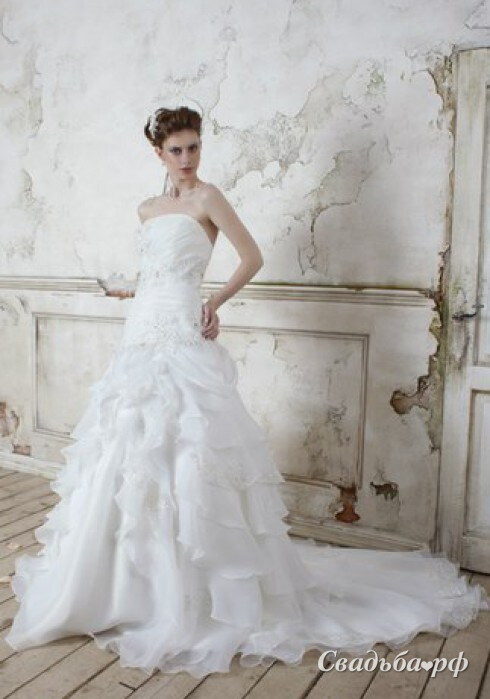 Воздушный свадебный наряд от именитого бренда Cristana Carrera идеально садится по фигуре. Заниженный корсет с открытой зоной декольте и сверкающими вставками деликатно скрывает малейшие недостатки. От уровня бёдер начинается пышная юбка с многоярусными воланами. Представленный наряд переходит в поистине королевский шлейф.