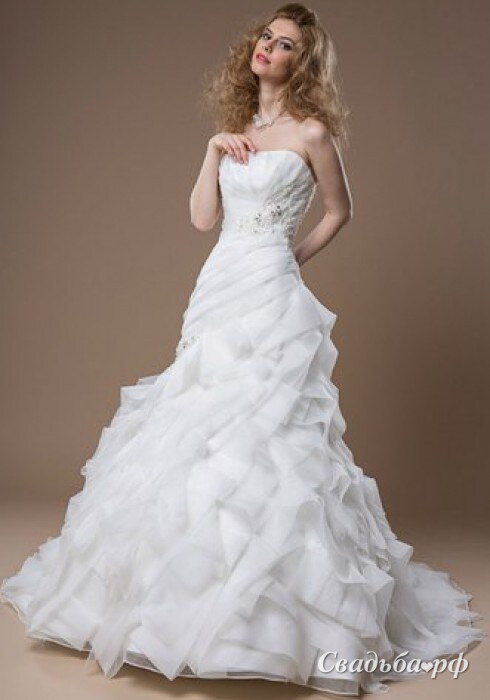 Очаровательное свадебное платье от всемирно известного бренда Cristana Carrera пикантно открывает зону декольте. Заниженный корсет с расположенными под углом складками драпировки идеально садится по фигуре. Талия украшена тонкой вышивкой ручной работы. Пышная юбка с многоярусными воланами необычной формы переходит в шлейф.