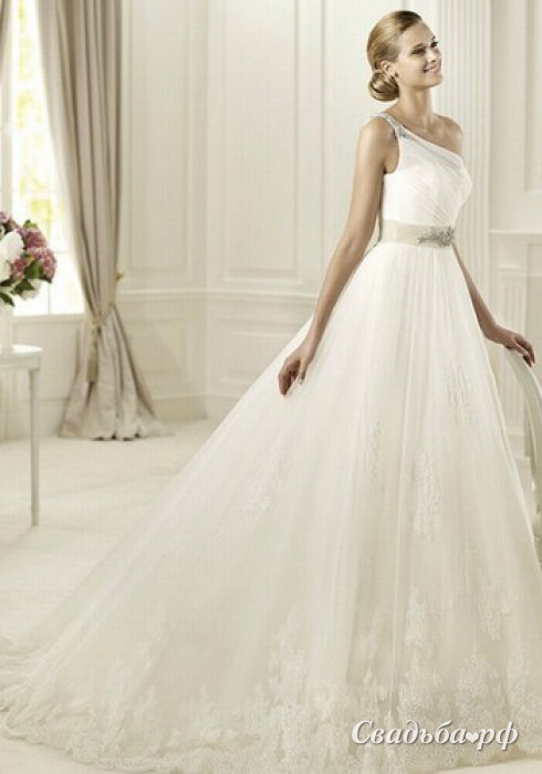 Очаровательное свадебное платье от испанского бренда Pronovias поможет создать невесомый образ прекрасной невесты. Тонкая драпировка миниатюрного корсета переходит на единственную бретель. Талия подчёркнута широким поясом со сверкающей вышивкой. Длинная юбка из полупрозрачной ткани украшена кружевными вставками и роскошным шлейфом.