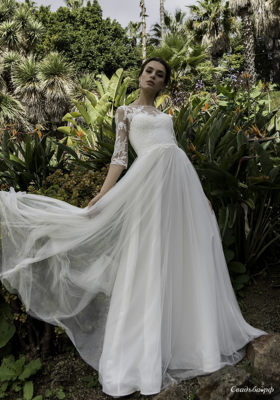 Это стильное свадебное платье выполнено из мягкой английской сетки и нежного кружева Шантильи