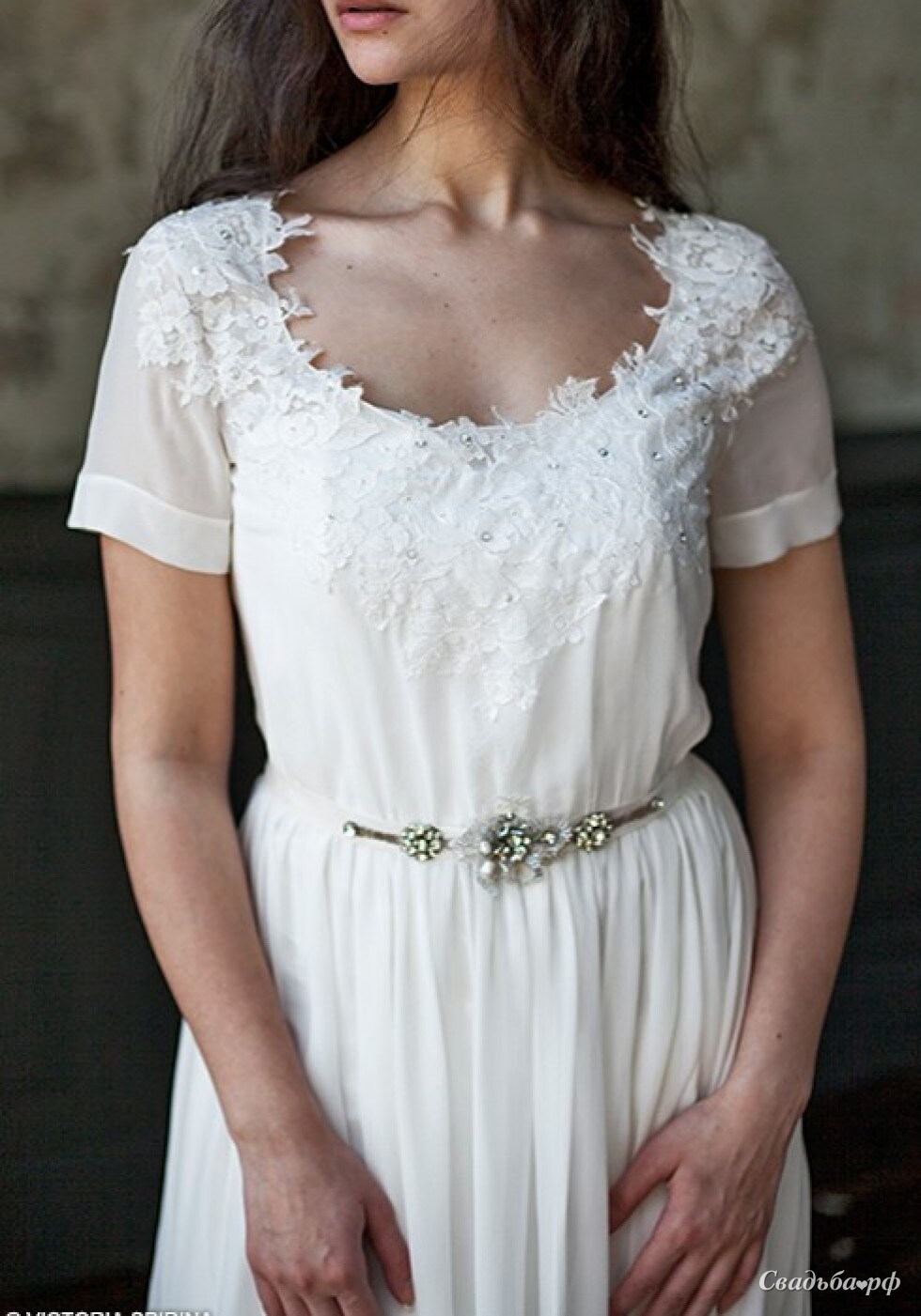 Воздушное свадебное платье из легкого шифона. Платье имеет плотный корсет на косточках и легкую шифоновую накидку с кружевом поверх корсета. Корсет на молнии.