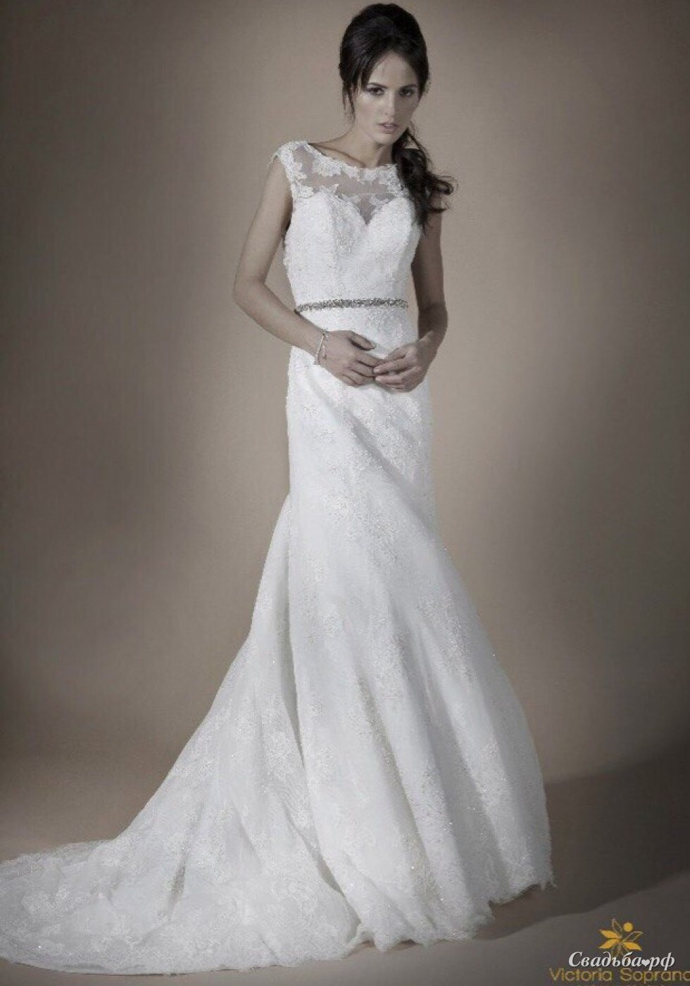 Романтичный свадебный наряд А-силуэта акцентирует внимание на оголённой зоне декольте и обнаженных руках невесты. Изящный корсет с кружевной драпировкой дополнен широким поясом с несколькими цветами ручной работы. Пышная юбка со множеством воланов из тонкой ткани отличается нестандартными формами и неземной лёгкостью. Модель дополнена шлейфом.