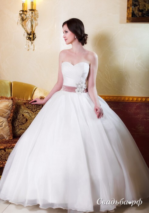 Сногсшибательный свадебный наряд классического А-силуэта представлен лучшими отечественными дизайнерами. Миниатюрный корсет с пикантной зоной декольте зрительно увеличивает бюст. Изюминкой модели является контрастный пояс с пучком цветов ручной работы. Пышная юбка напоминает лёгкое облако. Лаконичный и одновременно роскошный образ.
