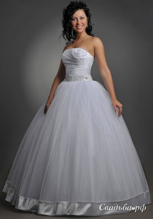 Безупречно белое свадебное платье А-силуэта – это беспроигрышный вариант для сногсшибательного образа невесты. Миниатюрный корсет с открытой зоной декольте украшен несколькими бусинами на груди и широким поясом с цветочными аппликациями. Пышная юбка окантована атласной лентой. Позвольте себе стать принцессой из волшебной сказки!