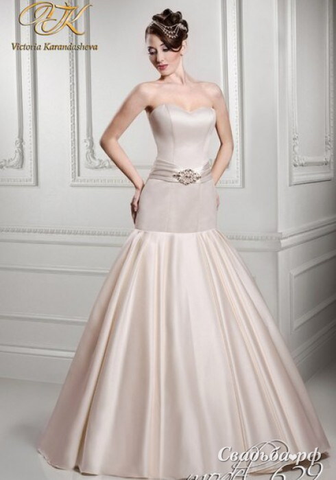 Самым стильным и требовательным красавицам понравится свадебный наряд от известного бренда Viktoria Karandasheva. Заниженный корсет с обнажённой зоной декольте и изящным срезом лифа поражает своей гладкостью. Талия подчёркнута широким поясом с переливающейся пряжкой. От уровня бёдер начинается пышная юбка со складками.
