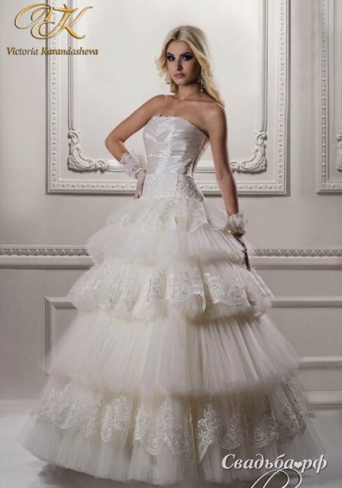 Эффектное платье от известного свадебного бренда Viktoria Karandasheva поможет Вам создать сногсшибательный образ принцессы нашего времени. Декольтированный корсет выполнен из переливающейся ткани. Пышная юбка с множеством ярусов из кружева и фатина придаёт наряду неповторимый шик и роскошь. В таком наряде Вас точно не забудут!
