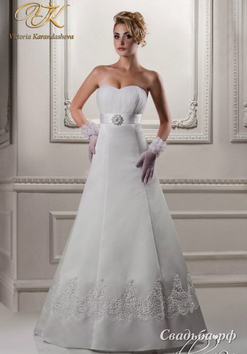 Самым стильным и притязательным невестам свадебный бренд Viktoria Karandasheva представляет этот наряд с открытой зоной декольте и безупречным силуэтом. Миниатюрный корсет с атласной лентой и сверкающей пряжкой приковывает взгляды к бюсту и осиной талии. Длинная юбка с тонкой вышивкой по нижнему краю постепенно расширяется к полу.
