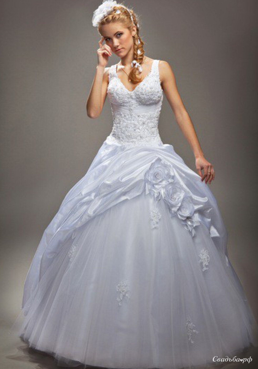 Корсет со вшитыми чашечками придаст дополнительный объем вашей груди, а слегка заниженная посадка корсета выгодно подчеркнет вашу талию. Корсет декорирован нежным кружевом, богато расшитым бисером и жемчужинами, юбка выполнена из легкой шанели, задрапированной объемным цветком (цветок съемный). Нижняя юбка из английского фатина (мягкий, матовый, без блеска) украшена аппликациями из гипюра в тон корсету.