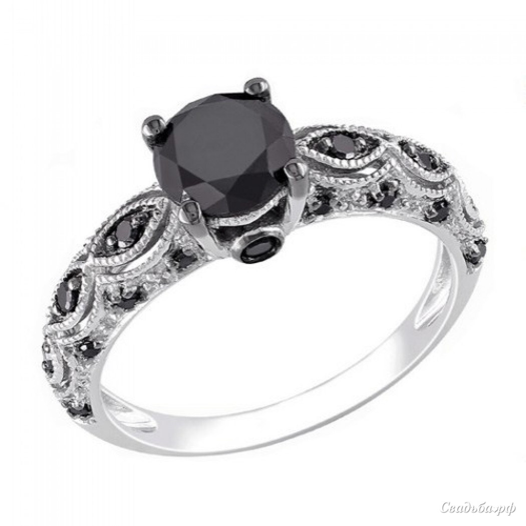 Восхитительное кольцо для помолвки с крупным черным бриллиантом декорировано узорами и вставками из небольших бриллиантов круглой огранки. Крапаны центрального камня частично покрыты черным родием.