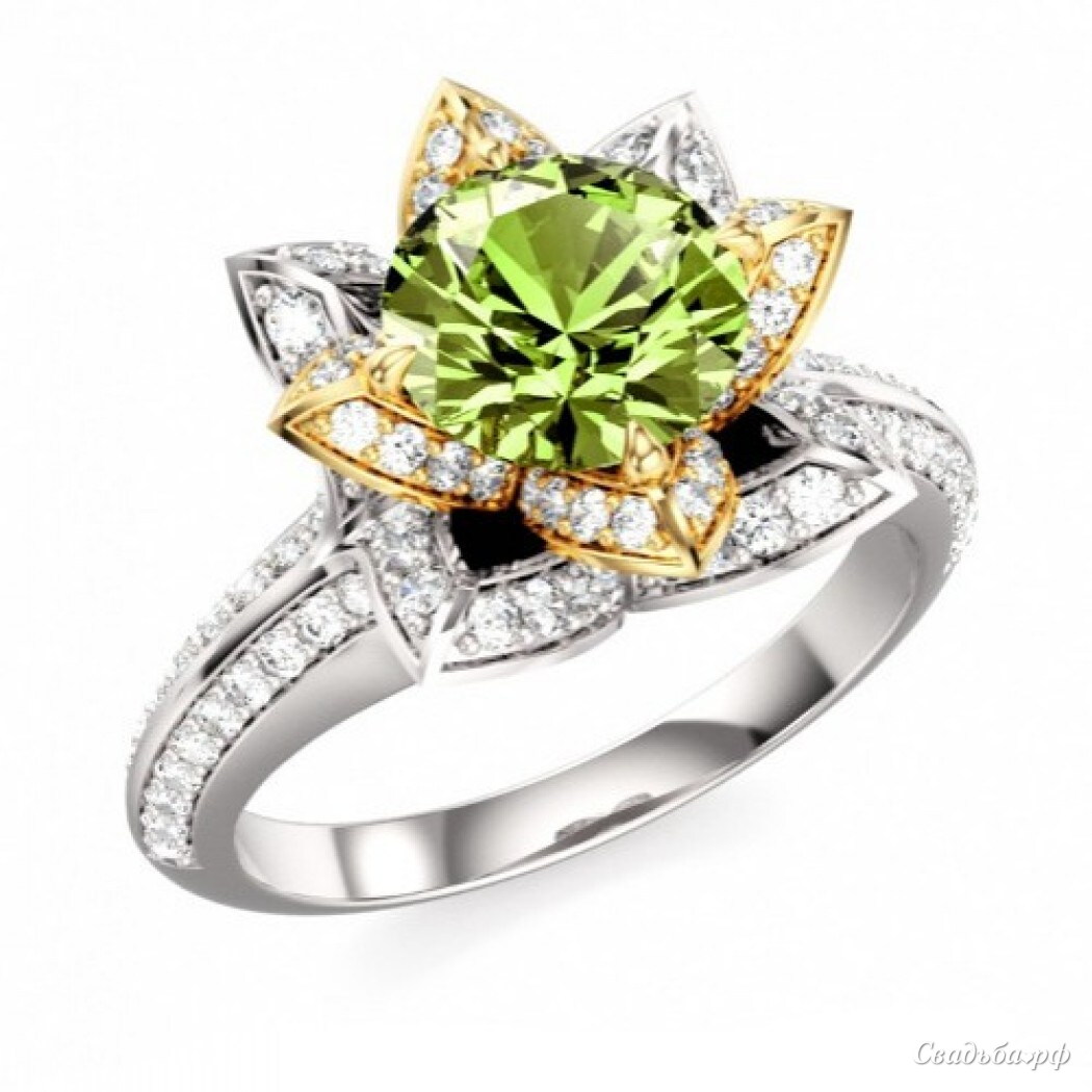 Красочное кольцо для помолвки в форме лотоса украшено крупным хризолитом и россыпью небольших бриллиантов круглой огранки.