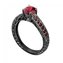 Стильное кольцо для помолвки покрыто черным родием и украшено яркими гранатами круглой огранки.