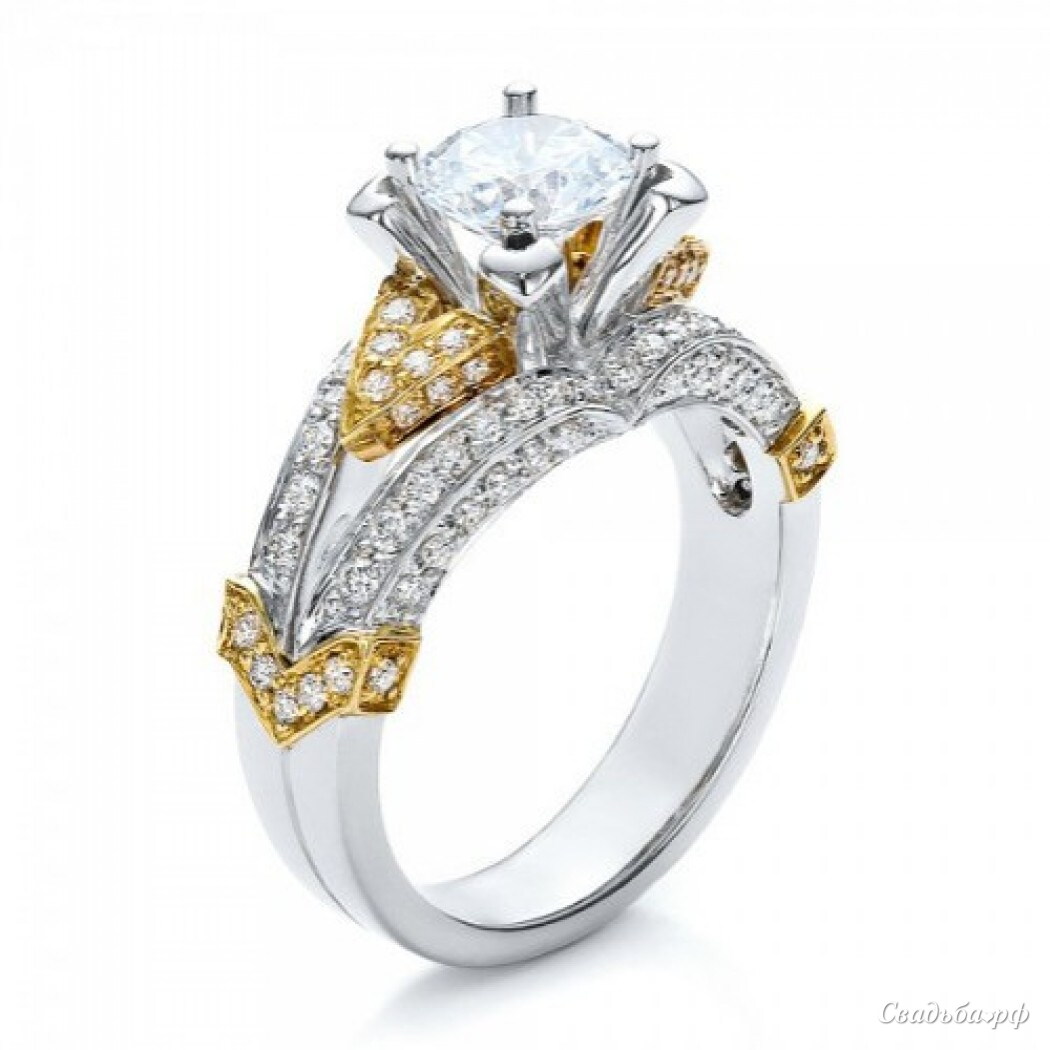 Изумительное кольцо для помолвки щедро украшено россыпью небольших бриллиантов и одним крупным бриллиантом круглой огранки.