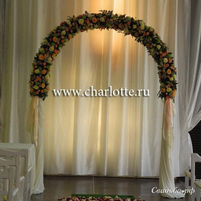 Арка для выездной регистрации. Из персиковых, кремовых и белых роз, вибурнума, гипсофилы с декоративной зеленью.