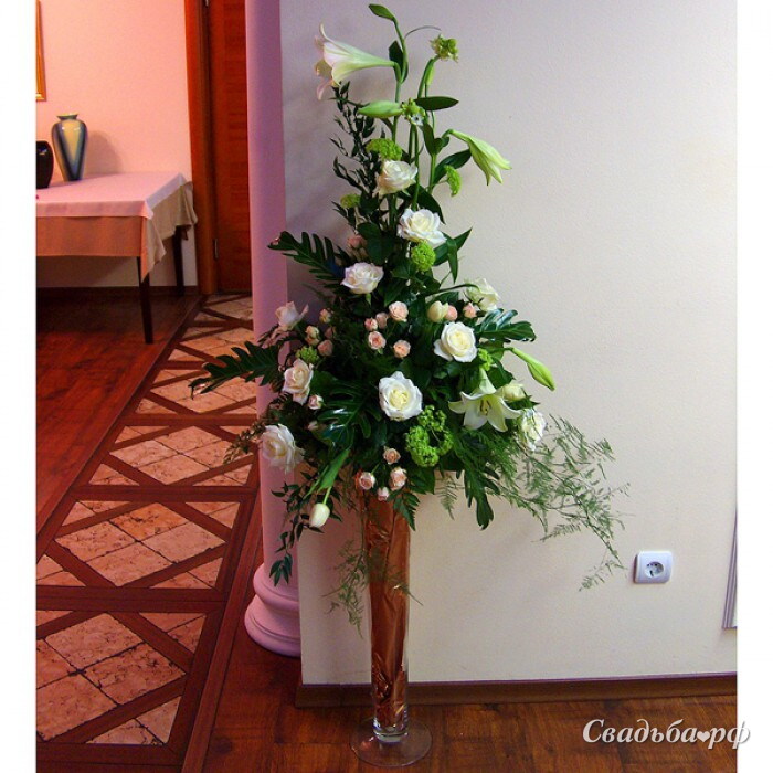 Композиция из роз, кустовых роз, вибурнума (калина), тюльпанов, лилий лонгифлорум, а так же множество декоративной зелени. В комплект композиции входит стеклянная ваза-подставка.