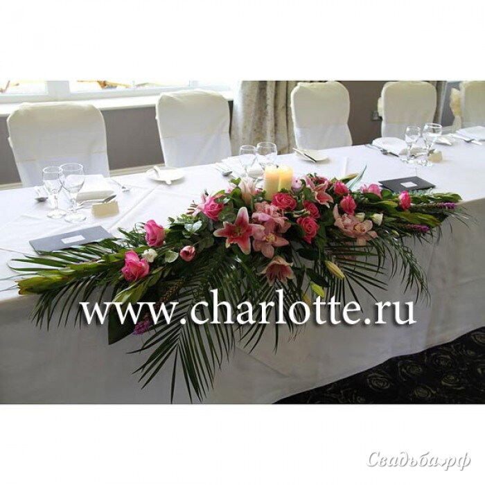 Композиция в розовых тонах из роз Аква, лиатрисов, орхидей цимбидиум, розовых восточных лилий с декоративной зеленью.