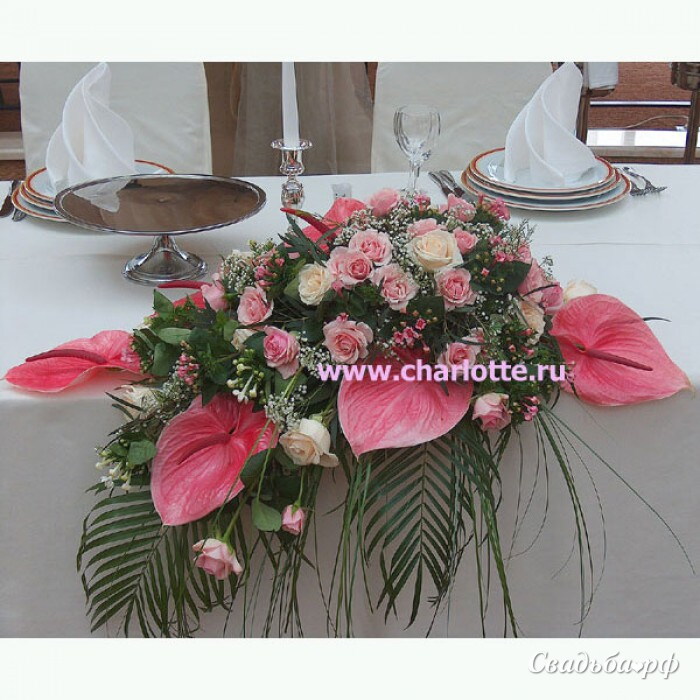 Композиция из живых цветов в розовых тонах, которая ставится на президиум перед молодоженами.