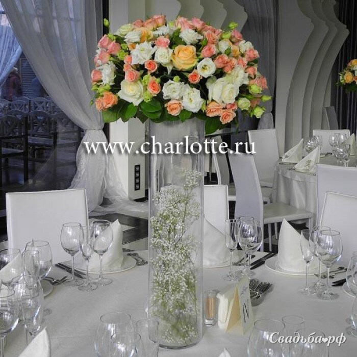 Настольная композиция из персиковых, кремовых и белых роз, лизиантусов с декоративной зеленью и гипсофилой.