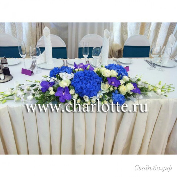 Композиция на президиум в бело-синих тонах из синей гортензии, орхидеи Ванда, белых роз, белых лизиантусов, орхидеи дендробиум с декоративной зеленью.