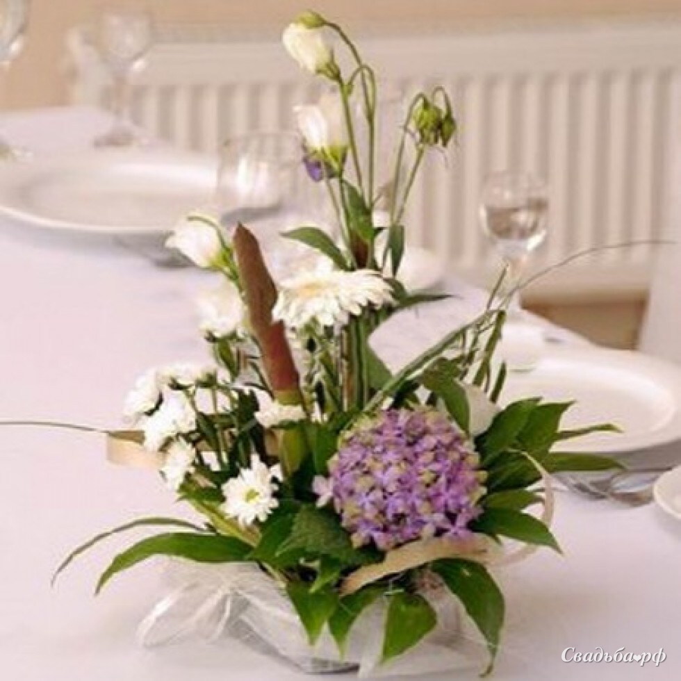 Состав: гортензия мини, лизиантус белый, гербера белая, хризантема сантини белая ромашка, рускус изр., оазис, декор