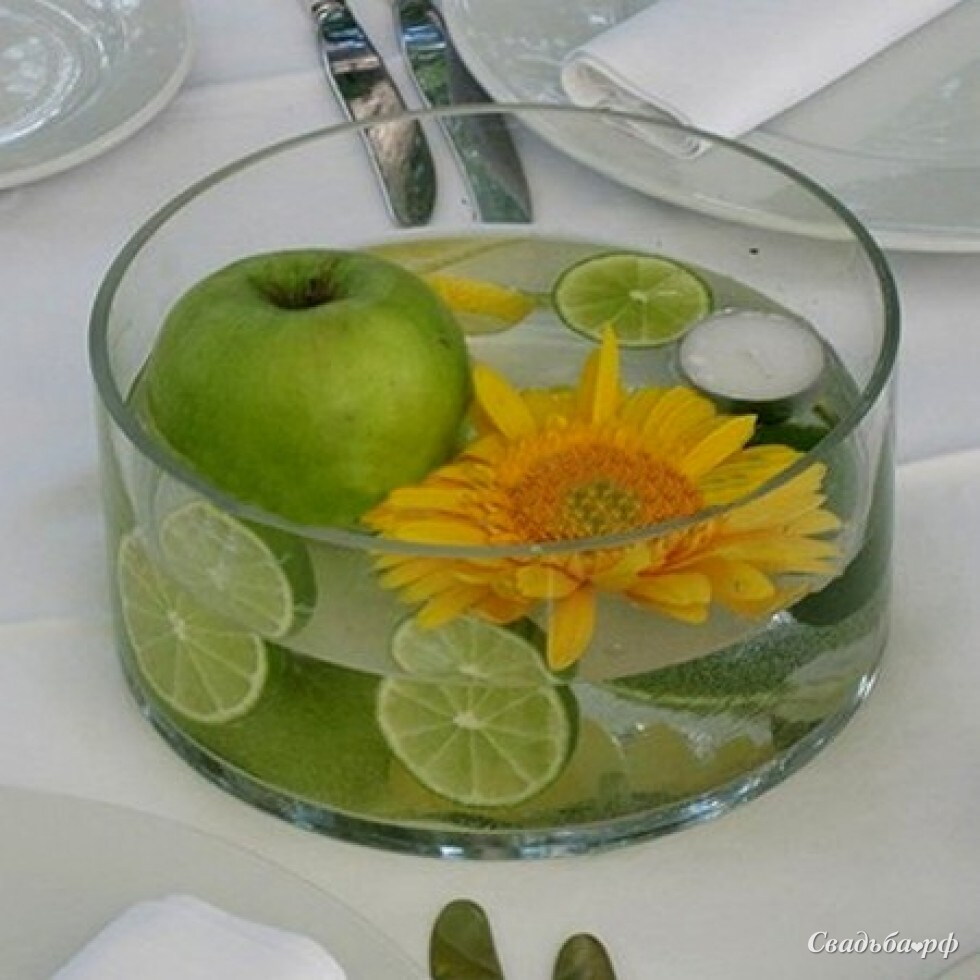 Состав: ваза, гербера желтая, яблоко зеленое, лайм, свеча плавающая в гильзе.