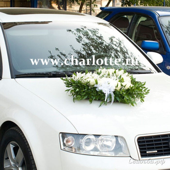 Украшение на авто из орхидей, роз, декоративной зелени в виде сердца.