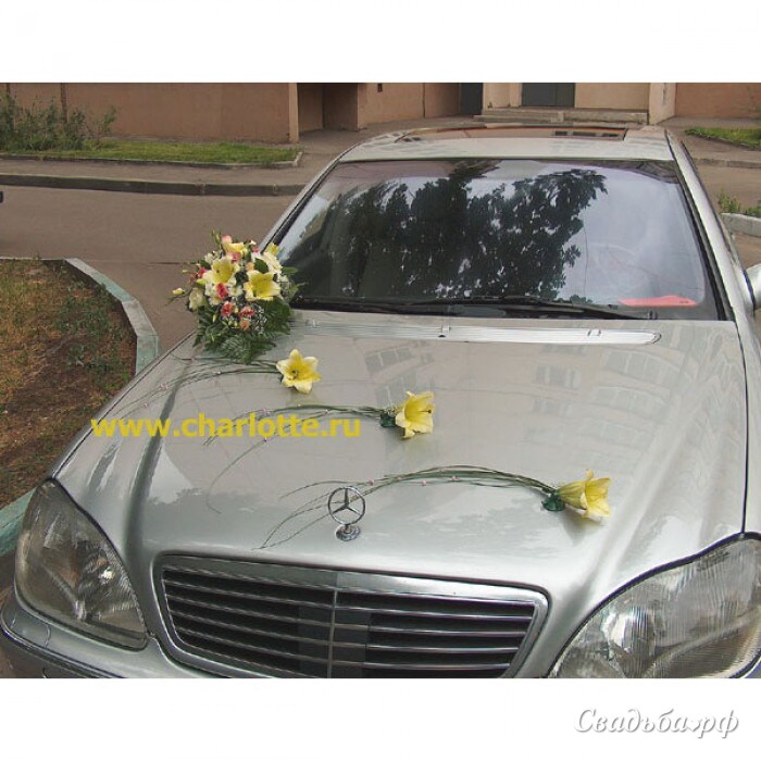 Оформление машины живыми цветами из лилий, роз и других цветов.