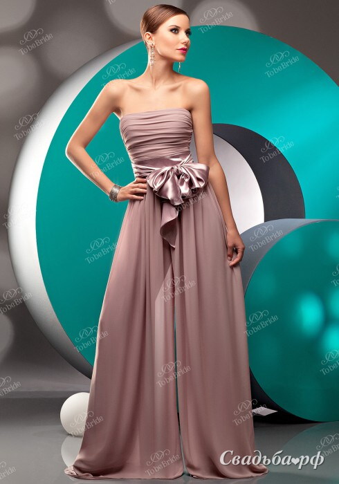 Оригинальный вечерний комбинезон кофейного оттенка выполнен из тончайшей ткани, такой эффектной и приятной на ощупь. Драпированный верх наряда украшен атласным поясом и крупным бантом. Широкие штанины напоминают юбку свободного покроя. Отличный вариант для оригинальных модниц. В таком стильном наряде Вас точно заметят!