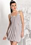 Жемчужно серый вечерний наряд придётся по душе и беременным красавицам. Это платье свободного покроя со множеством лёгких сборок смотрится стильно и элегантно, подходит для любого торжества. Вырез-лодочка по краю дополнен сверкающей вышивкой. Модель едва доходит до середины бедра и позволит Вам продемонстрировать свои ножки.