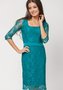 Голубое вечернее платье от лучших американских модельеров отличается универсальностью и безупречными формами. Этот наряд со скромной зоной декольте и кружевными рукавами можно надеть и по случаю официальной деловой встречи, и для выхода в театр. Талия подчёркнута пояском. Прямая юбочка доходит до уровня колен. Нежно и изысканно.